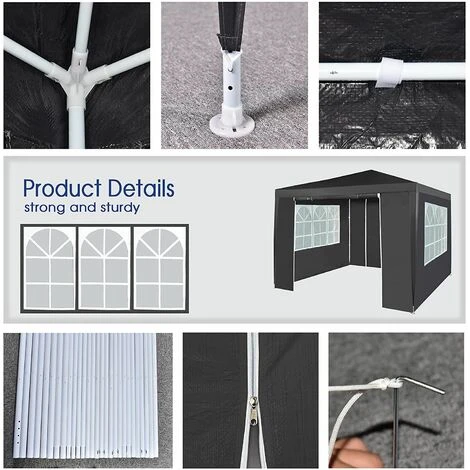 Gazebo Size: 300*300*255cmTube Diameter:18mm in powder coated steelRoof and Sides: PE 100g/m2 waterproof materialPackage Includes:1 x Frame Set1 x Canopy Top Cover4 x sidewalls (2 pcs with window + 2 pcs with zipper)1 x Set of Stakes & Ropes1 x Manual