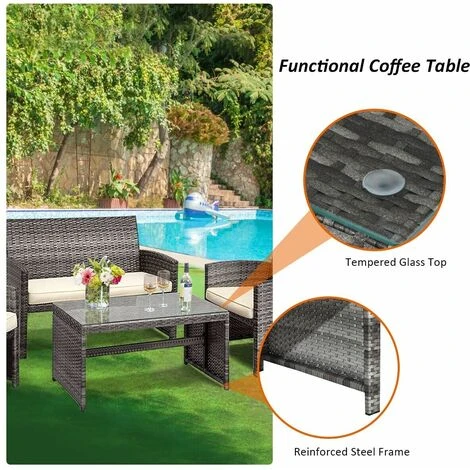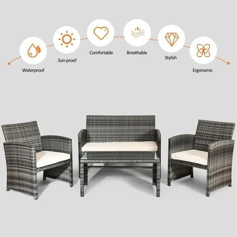 Material: PE Wicker, Metal, Tempered Glass, Polyester, Sponge