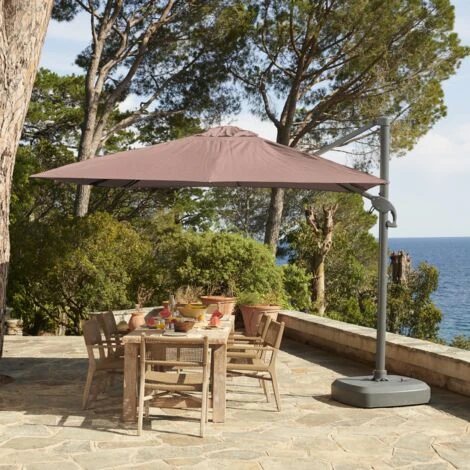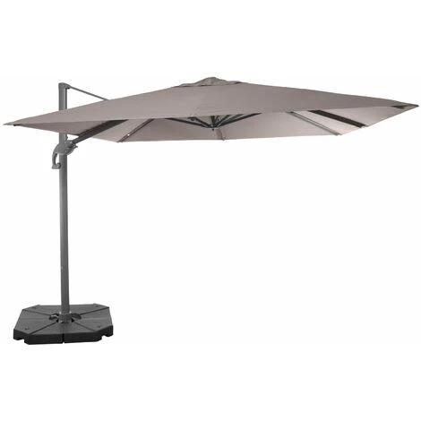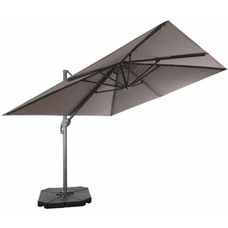 The Belveo parasol is vertically tiltable and can be rotated 360°. It has been designed to be fully repairable to increase its life span. It comes with a cross base, slabs or wheeled bases are not included.