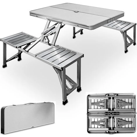 Foldable picnic table / camping table with 4 seats, parasol mounting and case function.