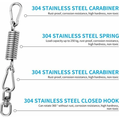 Package contents: 1 x one spring, 2 x stainless steel spring carabiners, 1 x one swivel hook.