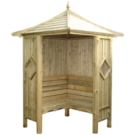 The Corner Arbour turns an unused corner of your garden or patio into the main feature! This corner arbour is a beautiful addition as well as a useful one giving you a lovely spot to enjoy a cup of tea. The bench seat inside takes two in comfort to provide that much needed shade or even shelter dependent on the UK summer weather! This arbour is manufactured from high grade, slow grown, approved, northern European pine which has been pressure treated to protect it from rot and insect attack for many years. (Imperial dimensions are approximate to the nearest foot; please refer to the exact metric dimensions in the data given). Supplied in its natural pressure treated finish, painted models shown are for illustration only.
