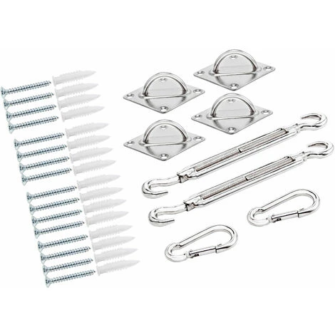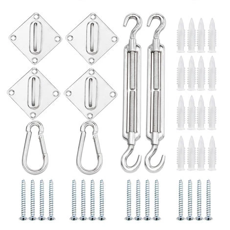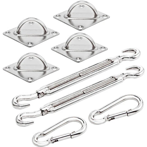 Complete sun sail fixing kit, made from, high quality and heavy duty chrome plated steel. The set consists of 40 pcs: