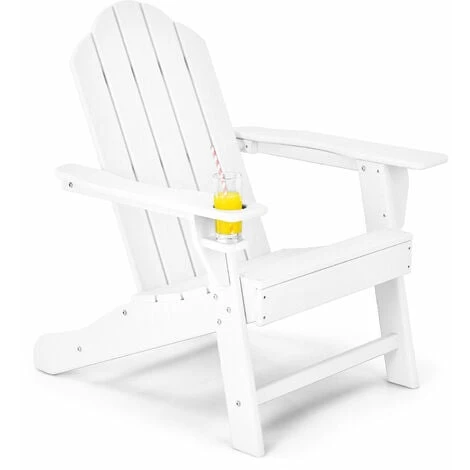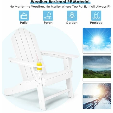 The ergonomic backrest, wide armrests, oversized seat and 103° elevation endow the ultimate comfort for you to sit on this Adirondack chair. Besides, the convenient cup holder brings the perfect place to put your drinks. Moreover, the weather resistant and fade resistant PE material ensure the durability for outdoor use. And the reinforced triangular structure makes this outdoor chair stable enough to hold up to 150 kg. Therefore, no matter the weather, no matter where you put it, it will always fit.