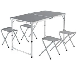 The folding table is complemented by 4 folding camping stools. The folding chairs can be easily transported along the folded camping table.