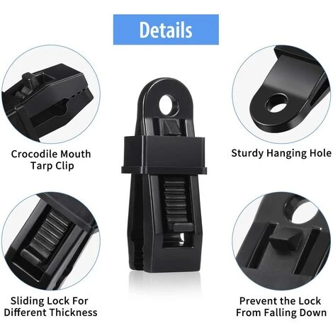 2. Reliable Quality: The tent trap clip is made of plastic material, it is waterproof, weatherproof, tearproof, lightweight and durable; Tarp clips can withstand freezing temperatures and bite into frozen or wet materials. Snap anchors are provided at the end of the clip, easy to attach to most standard hooks or ropes, no hole needed on the cover. 4.Multiple Use: These clips are suitable for outdoor camping tents air, awnings, caravans. , tarpaulins, canvas, boat covers, swimming pool covers, temporary shelters and other fabric covers, etc., suitable for outdoor adventurers, campers and travelers. bear large tensile force and not easy to loose after looping it on the tents, small fabric damage. It is durable and can be used repeatedly.