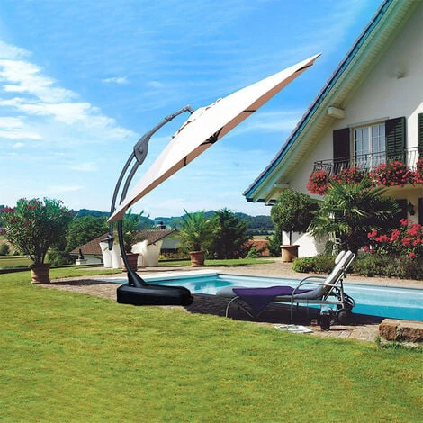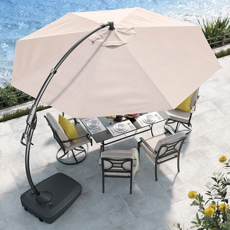 - HUMANIZED DESIGN: Offset patio umbrella includes base with hidden wheels for easy movement. The base must be filled with 120KGS of sand and water for stability and safe use.