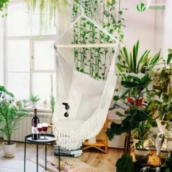 VOUNOT Swing Chair With Round Seat Cushion, Macrame Hammock Hanging Chair For Indoor, Outdoor, Beige