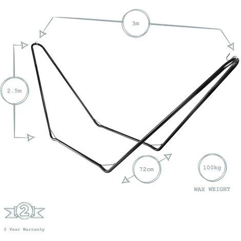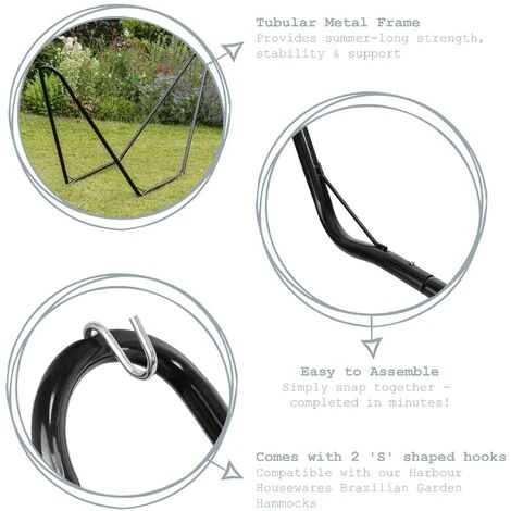 Sturdy metal frame that simply slots together. Hammock hangs on hooks