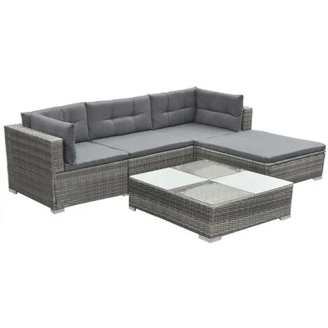 This rattan garden sofa and table set will make a great addition to your outdoor living space. It will add a touch of modern elegance to your patio, balcony or garden with its understated, yet stylish design. Made of weather-resistant and waterproof PE rattan, the set is easy to clean, hard-wearing and suitable for daily use. The powder-coated steel frame makes the set very sturdy and durable. Thanks to the lightweight construction, it is easy to move around. This set is delivered with highly comfortable, thickly padded seat and back cushions. The cushion covers are removable and washable. Delivery includes 2 corner sofas, 1 centre sofa, 1 stool, 1 coffee table and 9 cushions. Note: We recommend covering the set in the rain, snow and frost.