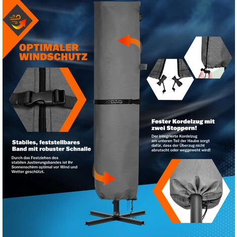This high quality sunshade protective cover by Kingsleeve® has the perfect size for parasols with a diameter of up to 330cm. The cover measuring 200x30cm is made of UV-resistant, tear-proof, easy-care polyester (160g/m²). Thanks to its durable, water-repellent PA coating, our cover is weatherproof. This keeps your parasol dry and protected even in snow, rain and wind.