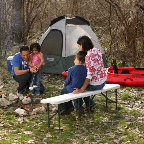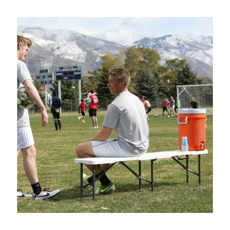 The Lifetime 6-Foot Fold-In-Half Bench is constructed of high-density polyethylene and powder-coated steel. The lightweight design makes it simple to store and easy for anyone to set up and take down. The bench is UV-protected, will not crack, chip, or peel, and is built for indoor and outdoor use. The patented steel frame design provides a sturdy foundation and is protected with a powder-coated, weather-resistant finish. Ideal for soccer games, pool-side activities, and more, Lifetime’s Fold-In-Half Bench is the perfect addition to your home.
