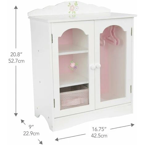 FEATURES: 2 double closet doors featuring a hand-painted flower pattern, 1 openable drawer, 3 storage shelves & 3 hand-painted baby doll clothes hangers.