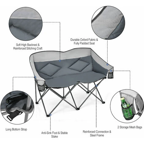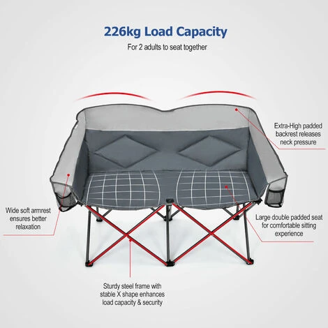 Our foldable double camping chair is made of high-strength oxford fabric and heavy-duty powder-coated steel, ensuring great durability and a large bearing capacity of 226 kg. Besides, the fabric is breathable and you would not feel stuffy even on hot summers. More importantly, the foam-padded seat, backrest, and armrests are filled with high-density sponges, providing you with ultra-soft comfort for long-time sitting without feeling tired. In addition, the chair is supported by 6 metal legs and X-shaped frames, guaranteeing great stability and safety. Other than that, the 2-person portable camping chair can be folded and opened in seconds, and the compact carrying bag would help you store it for easy transportation, so you can take it to the lakeside, campsite, beach, patio, deck, cabin, lawn, or anywhere you want!