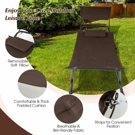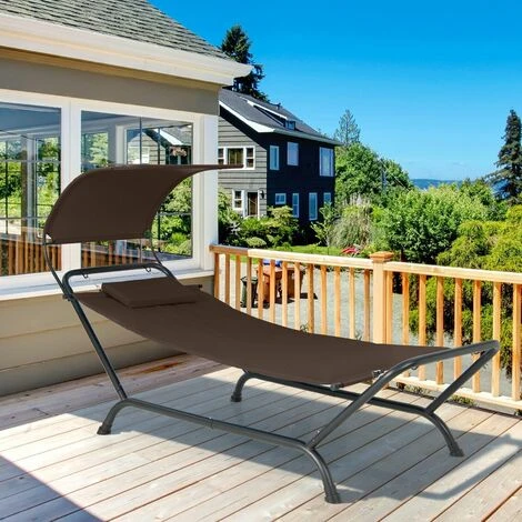 Supported by a heavy duty metal frame with rustproof powder-coating, this patio hammock is stable and strong enough to hold up to 160 kg. The thick and soft padded cushion will give you an ultra relaxed experience. And the removable pillow is included to provide extra comfort and head support. Meanwhile, this hanging chaise lounge features a large shade canopy to let you enjoy a leisure break outdoors. The wide hammock bed space is enough for you to fully stretch out in comfort. Besides, the storage bag next to the hammock helps you to store some magazines, snacks, sunglasses conveniently. As a perfect combination of stylish look and comfortable design, this hammock with canopy can greatly level up your outdoor space.