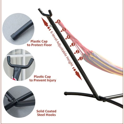 Hang your hammock anywhere without the need of a tree, thanks to this stand from Outsunny. Made from powder coated steel for ultimate strength and durability, it features six holes all spaced 10cm apart from each other to adjust your hammock to your preference. Suitable for all style designs, including string styles, it is safe, stable and weather resistant, making it perfect for using all year-round. Smart, useful and much needed for when you want to relax outdoors. Specifications: