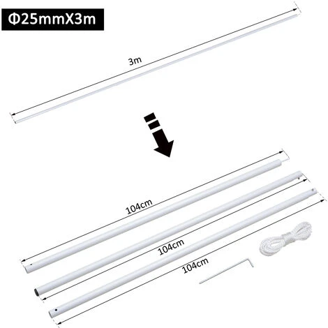 • 3m pole kit includes: 3 x 100cm iron pole Dia.25mm, 1 x 19cm ground spike, 1 x 4m white PE rope