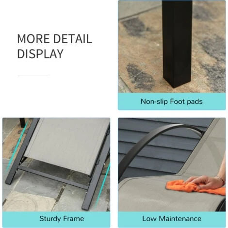 Refresh your outdoor space with the garden recliner chairs set of 3 Outsunny. Using metal for the frame of both chairs and a table, the structure is tough and durable, so it can be used every day. The sun loungers for garden are wrapped in breathable mesh for comfort and smoothness on the skin. The table comes with a thick glass top for a safe and secure holding place. Stylish and functional, this set is perfect for patios, gardens, balconies and any other outdoor space. Assembly is required. Specifications: