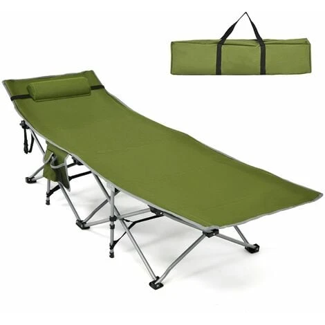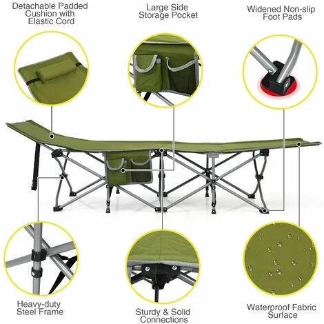 Our foldable camping cot provides you with comfortable sleeping experience outdoors. Since its folding design, you can easily set it up in minutes. Also, you can store it into a carrying bag without taking up living space. Our sleeping cot is sturdy and durable with heavy-duty steel frame and premium oxford cloth. The widened foot pads can prevent the cot from sinking, which is ideal for outdoor activities. The side pocket and detachable padded pillow also bring you convenience during use. The camp cot is suitable for camping trips, days at the beach, and lounging under the stars. Why not carrying this camping cot with you for the next adventure.