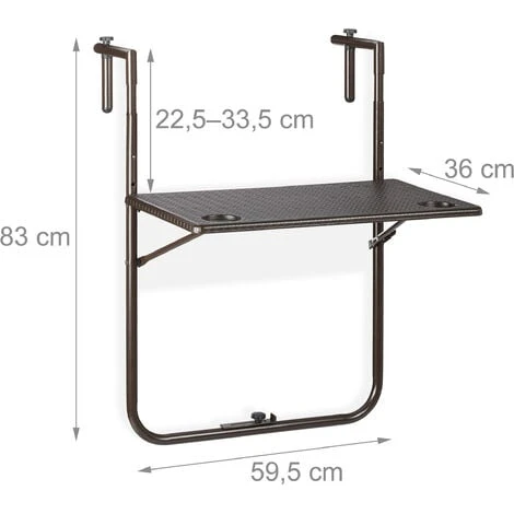 This brown balcony hanging table is has 3 height settings and equipped with 2 drink holders. It has enough space for 2 people and is simply hung on the railing. The folding table has a plastic tabletop with a stylish rattan effect. It can easily be wiped clean with a damp cloth. The metal frame ensures stability and means that the hanging table can be loaded with up to 20 kg. Thanks to the folding function, the balcony table is a real space saver and is particularly good for narrow balconies.