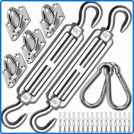 - Shade Sail Installation Kit: Contains 2 hanging hooks; M8 spring, 2 M8 turnbuckles, 4 wall brackets, 16 screws, 16 plastic anchors. The sun visor fixing accessory kit ensures sufficient tension. The shade sail hardware kit is delivered with the essentials, you can safely hang your shade sail. and easily