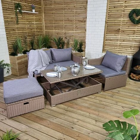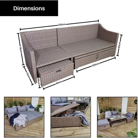 Brighten your backyard or garden with this modular garden sofa set that can be positioned to suit the occasion. With multiple comfortable options available, this rattan cube garden furniture is great for lounging, dining or sunbathing in the sun. The glass coffee table has an easy-to-use hydraulic system that can be heightened to your needs. Once you’re done, the table top can be lowered for easy storage overnight or throughout winter. The outdoor sofa bed provides comfortable seating positions, including pillows and cushions to create the perfect lounge set. Sit back and relax with the footstool as a daybed or dine in style with the additional option as a sofa table patio set. The brown footstool pairs as handy garden chairs or provides an easy-to-use garden storage solution for all your seat cushion protection requirements. Can be used as a garden set, patio furniture or as an easy balcony table and sofa. The provided instructions make the rattan sofa easy to setup and maintain for many years. Small Sofa Size: 71cm x 75cm x H:76cm. Large Sofa Size: 71cm x 135cm x H:76cm. Coffee Table / Lounger: 64cm x 123cm x 29cm (hydraulic reclining up to 65cm). Footrest: 64cm x 63cm x H: 28cm. Seated depth: 64cm x H: 40cm.