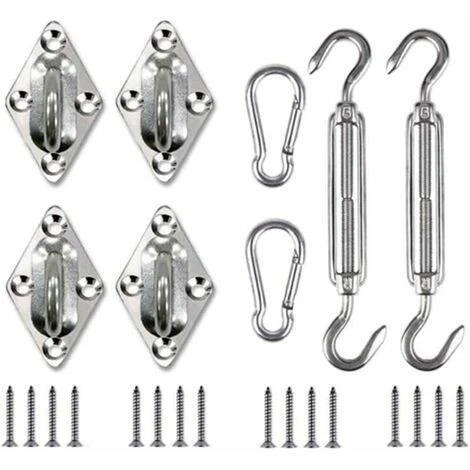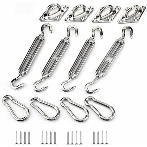 Useful awning attachment set: stainless steel attachment set for your awning. Connection between support, wall and shade sail. Suitable for terrace and garden. Details: – Material: stainless steel. – Weight: 380g – For secure support and optimum tension. – Diameter of each piece: 5 mm each. – Wall bracket: diamond shape, plate thickness: 2mm, body thickness: 5mm, hole: about 5mm. – Carabiner: Length: 5 cm. – Tension screw: range 130-180 mm. The set includes 4 wall brackets, 4 carabiners, 4 turnbuckles and 16 screws