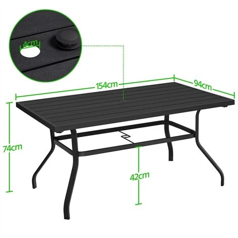 On this outdoor dining table, you can enjoy the beauty of nature while having dinner with your family, reading a book or having a cup of coffee. The black overall metal construction ensures years of performance and durability. Weather and oxidation-resistant features ensure that the table can be used even on summer or rainy days, and you can add a brightly colored umbrella for outdoor dining that will create an area to enjoy.