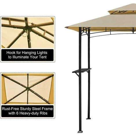 PA Coated Polyester Fabric:Waterproof, anti-UV and fade-resistant polyester fabric. The 2-tier vented top offers smoke ventilation. | Different Installation:We offer 3 options for you to satisfy your different needs. You can install this gazebo canopy on the wall or on the grass, solid brick floor and even on a wooden floor. | Specification:Overall dimension: 8’(W) x 5’(D) x 8’(H) Shelf dimension: 3.7’(L) x 0.66’ (W) Shelf Height: 3.61’(H) |